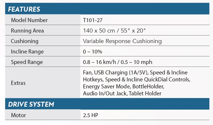 T101 Treadmill T101 Treadmill Horizon T101 Treadmill This best-selling treadmill is a favoritefor a reason. With Bluetooth speakers,an integrated fan, easy assembly and a foldingframe, the T101 is a great balance of features,quality and value.
